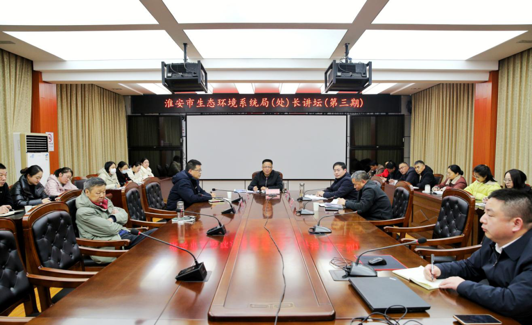 12月19日下午,淮安市生态环境系统第三期局(处)长讲坛在市局一楼会议室召开,主会场与各县(区)局线上分会场同步联动,市局领导班子、机关中层以上人员、直属单位主要负责人及各县(区)局相关负责同志参会。讲坛聚焦月度环境质量分析与秋冬季、明年开春大气管控应对重点工作,凝聚污染防治攻坚合力。