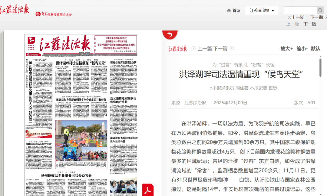 如今的洪泽湖流域,生态圈愈发稳定向好。鸟类总数已从昔日的20余万只飙升至80余万只,其中国家二级保护动物花脸鸭的种群数量超过4万只,创下国内目前发现该种群数量最多的区域纪录;曾经的迁徙“过客”东方白鹳,现在成了这里的“常客”,监测到的栖息数量已增至200余只;11月11日,更有31只世界极危珍稀物种——白鹤,从盱眙铁山寺国家森林公园上空掠过,这是时隔14年,淮安地区首次确凿的白鹤过境记录。这些鲜活的数据,是洪泽湖流域生态提质的生动见证,更是法庭以法护鸟、以情守湖的坚实成效。