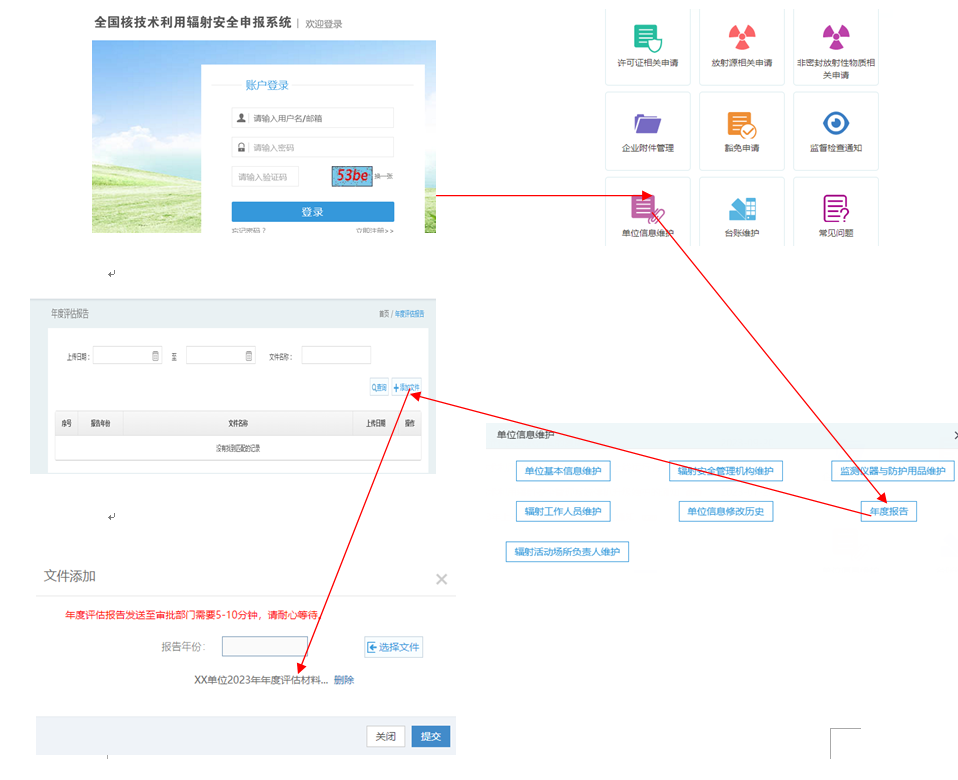 登录全国核技术利用辐射安全申报系统(网址:http://rr.mee.gov.cn/rsmsreq/login.jsp)或者直接搜索“全国核技术利用辐射安全申报系统”--使用各单位辐射安全许可证申报帐号及密码登录--点击“单位信息维护”--点击“年度报告”--点击“添加文件” --点击“报告年份选择2025年”--点击“选择文件”--添加本次需要上传文件压缩包--点击“提交”即上传完成。