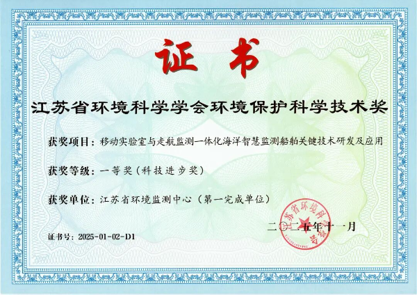因其显著的创新性与应用价值,该成果荣获2025年度江苏省环境科学学会环境保护科学技术奖一等奖(科技进步奖)。基于该成果打造的江苏首艘海洋生态环境监测执法船——“中国环监苏001”自2022年四季度投运以来,累计航行超19000海里,成功执行31项重大专项监测及突发环境应急任务,已成为我省履行海洋及沿江生态环境监测、应急响应和监督执法职责不可或缺的核心利器,实战效能得到充分验证。